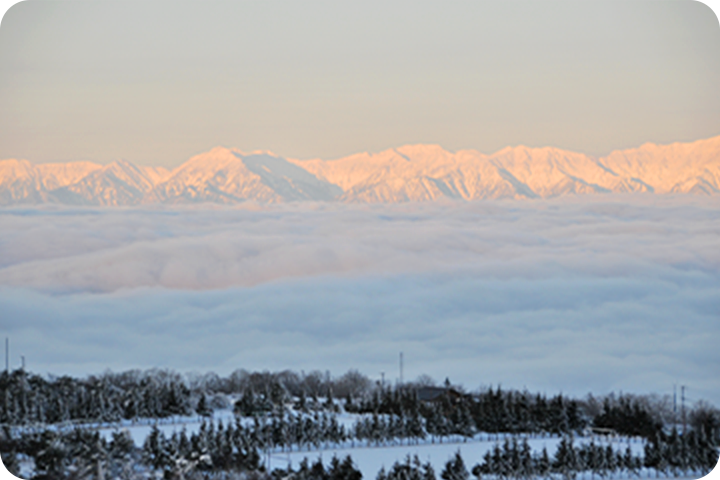 菅平唯一のフード付きトリプルリフトを降りた山頂からは、日本アルプスの雄大な眺望を満喫できます。
